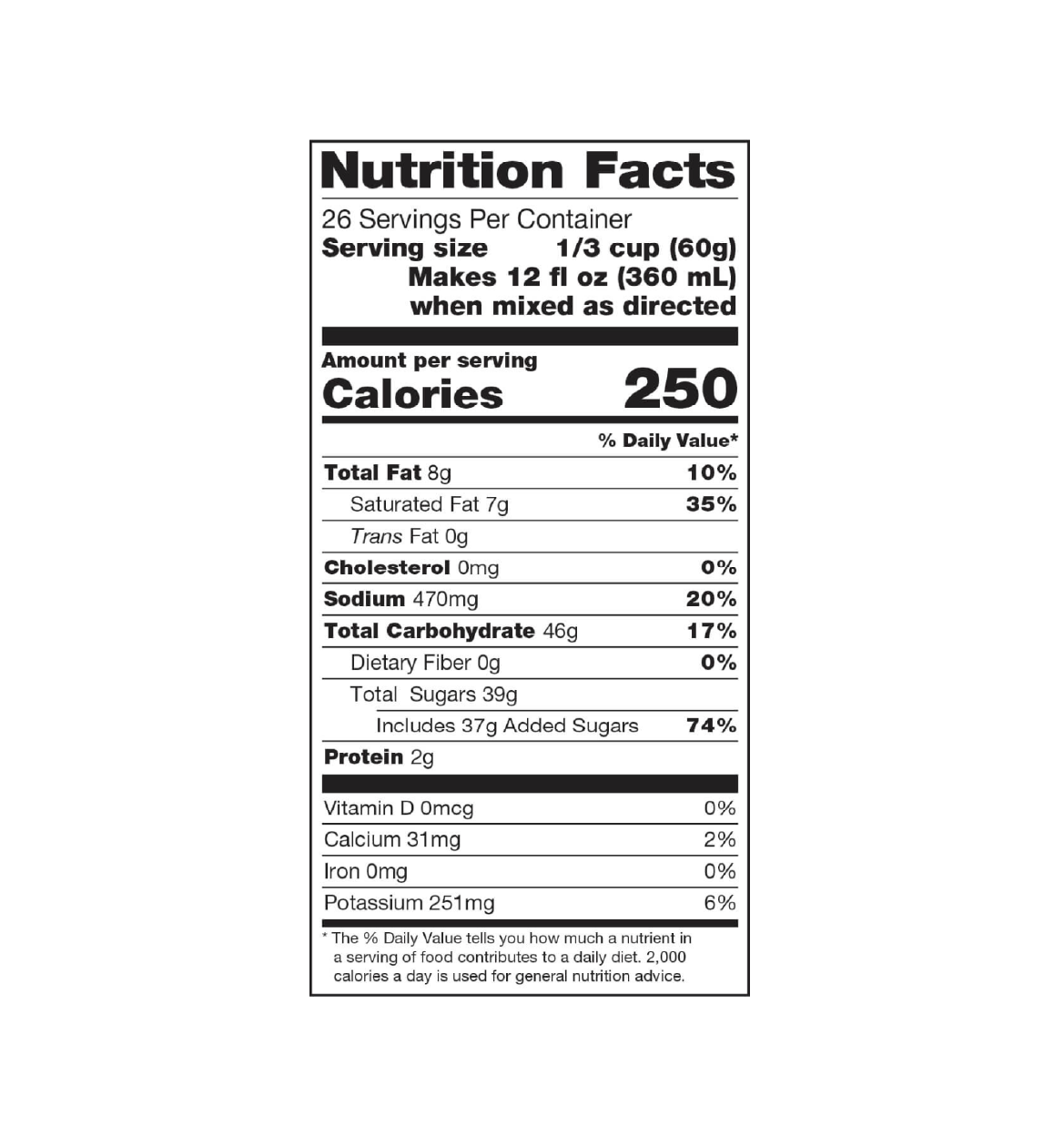 Ingredients: Sugar, Fructose, Coconut Oil, Maltodextrin, Natural Flavors, Whey, Nonfat Milk, Silicon Dioxide (Anticaking Agent), Salt, Sodium Caseinate, Colombian Coffee. Contains Less than 1% of Mono and Diglyclerides (Emulsifier), Dipotassium Phosphate, Guar Gum, Xanthan Gum, Pectin, Soy Lecithin (Emulsifier).