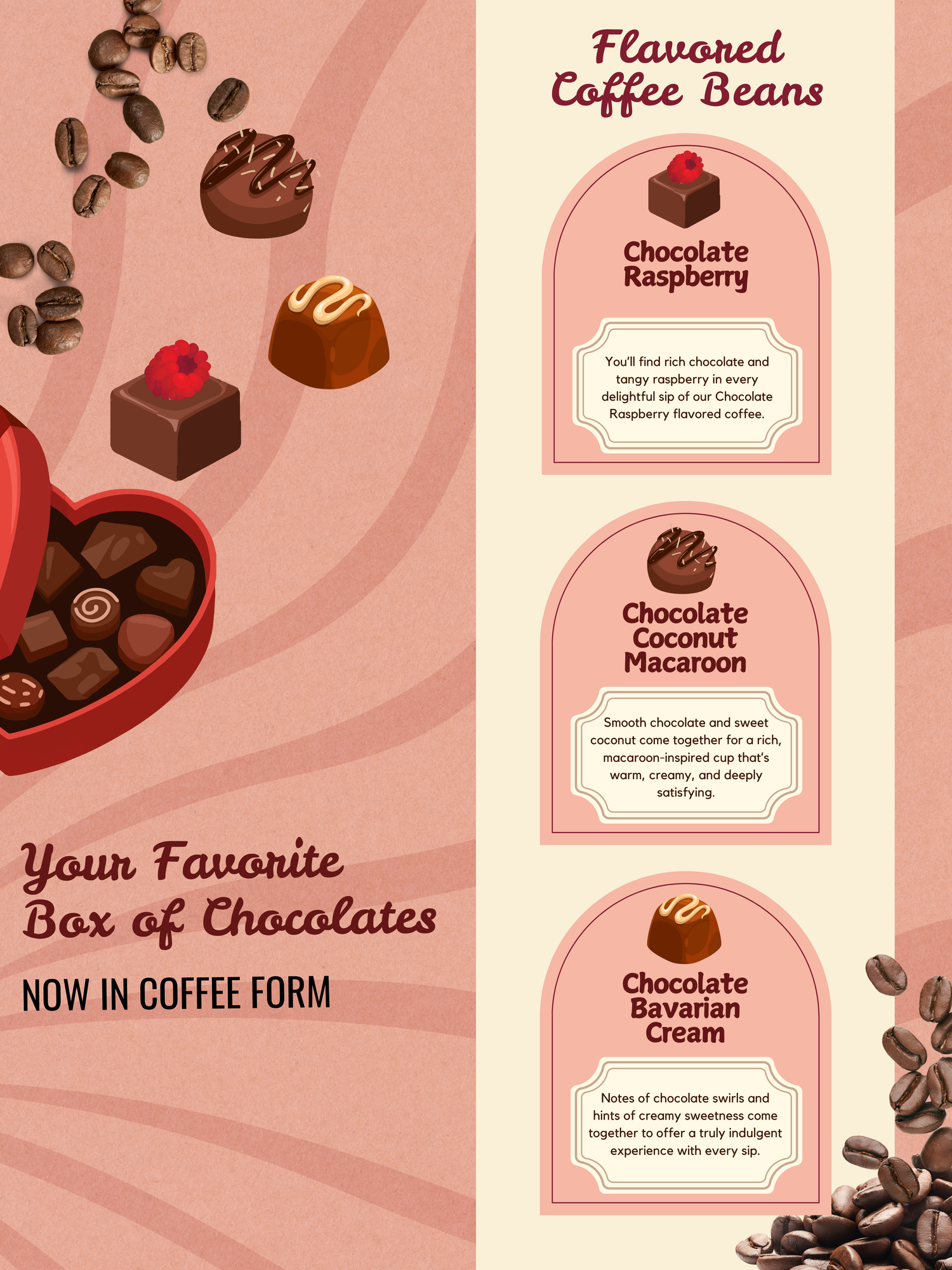 Enjoy three chocolate-inspired flavored coffees in one seasonal sampler. The Chocolate Collection features Chocolate Raspberry, Chocolate Bavarian Cream, and Chocolate Coconut Macaroon for a sweet variety in every cup.