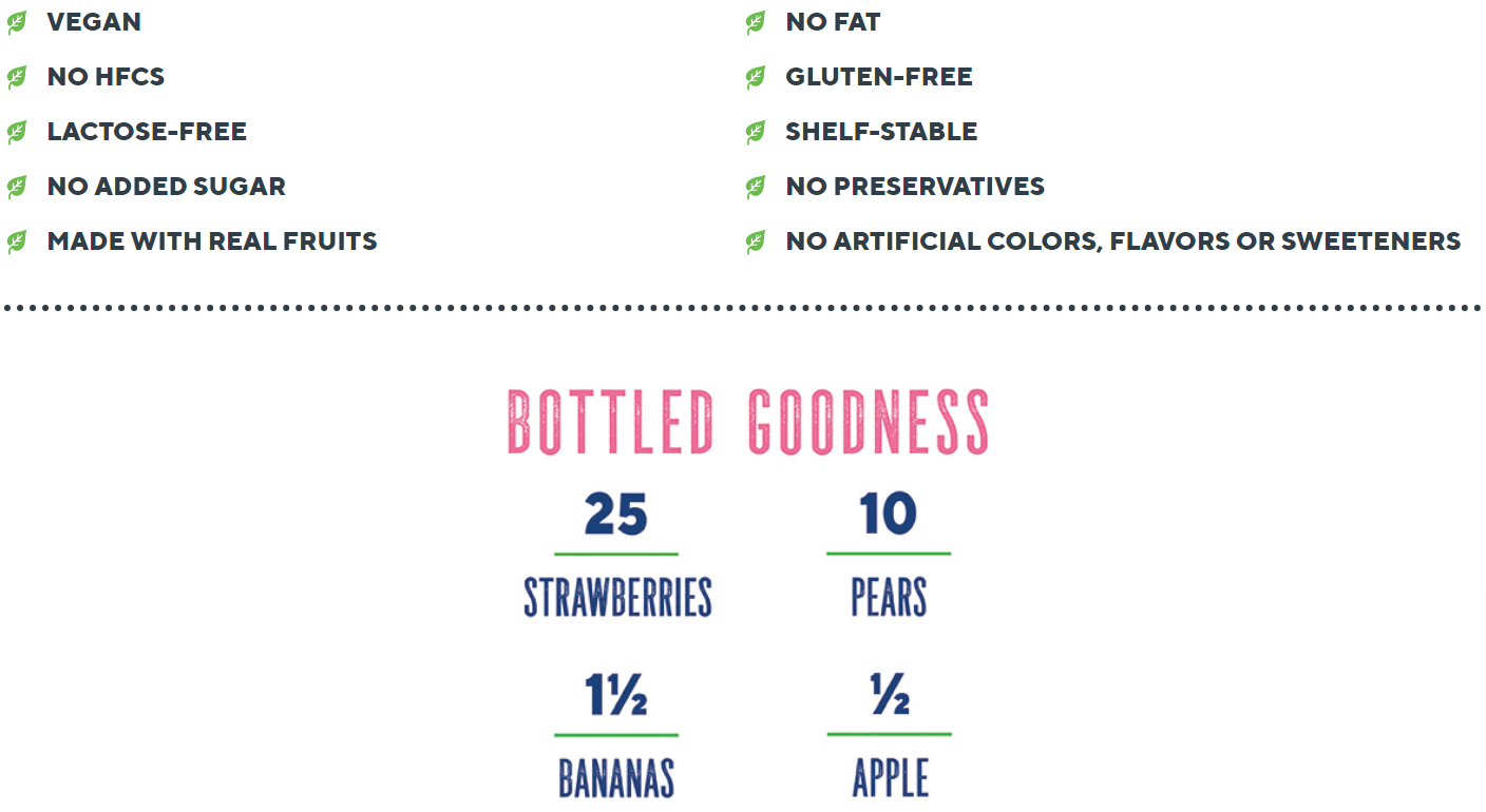 Ingredients:Fruit (Strawberry Puree and Banana Puree), White Grape Juice from Concentrate, Pear Juice from Concentrate, Filtered Water, Natural Flavors, Apple Juice from Concentrate, Fruit and Vegetable Juice (for Color), Locust Bean Gum, Xanthan Gum, Ascorbic Acid.