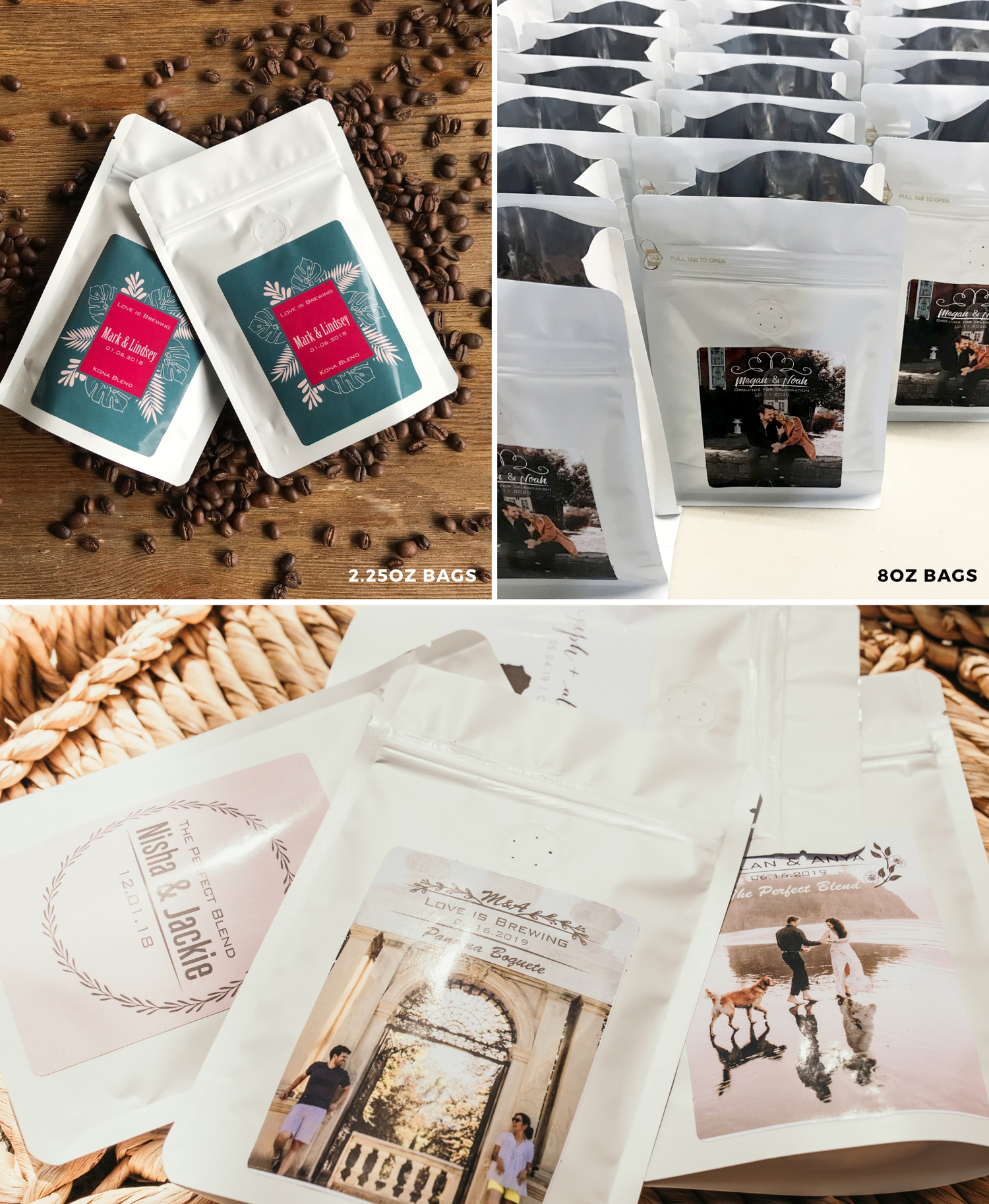 • Your choice of 2.25oz, 8oz, or 12oz personalized coffee bags