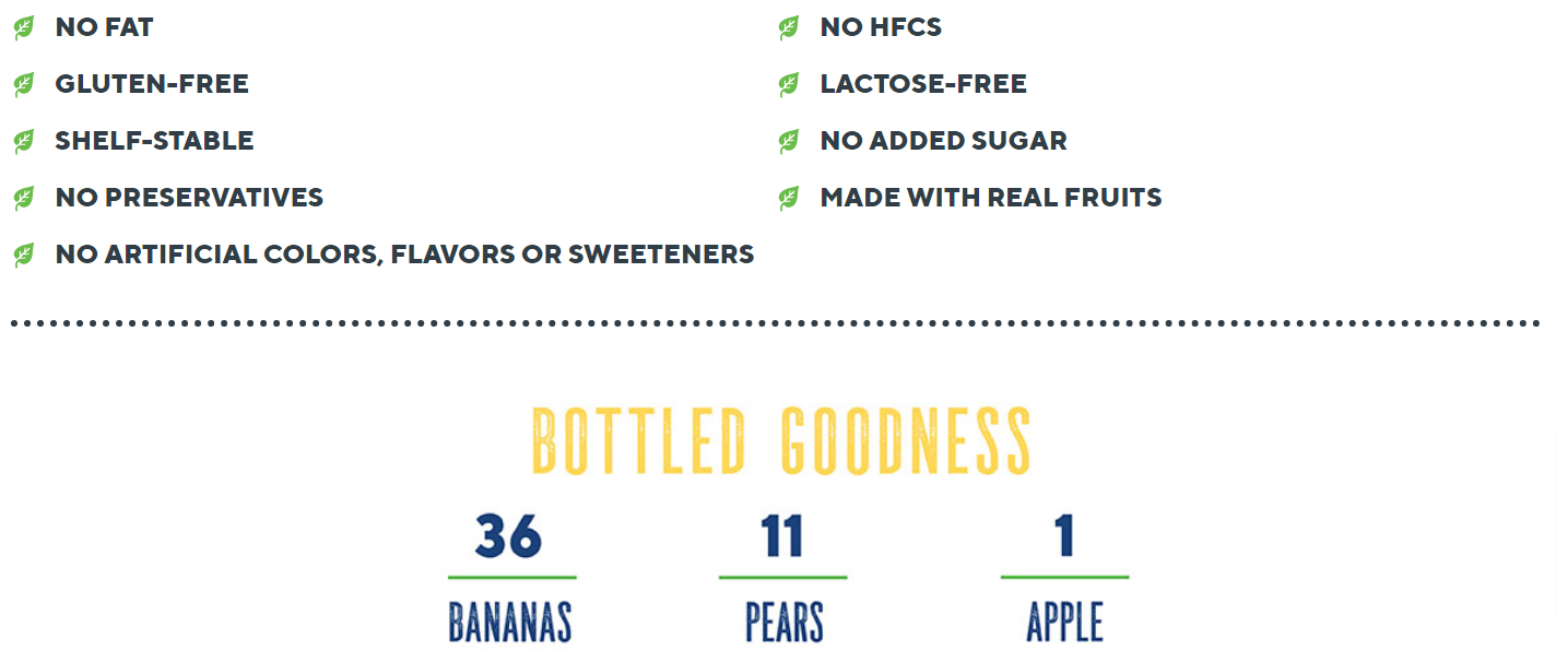 Ingredients: Banana Puree, Pear Juice Concentrate, White Grape Juice Concentrate, Filtered Water, Apple Juice Concentrate, Natural Flavors, Citric Acid, and Beta Carotene.
